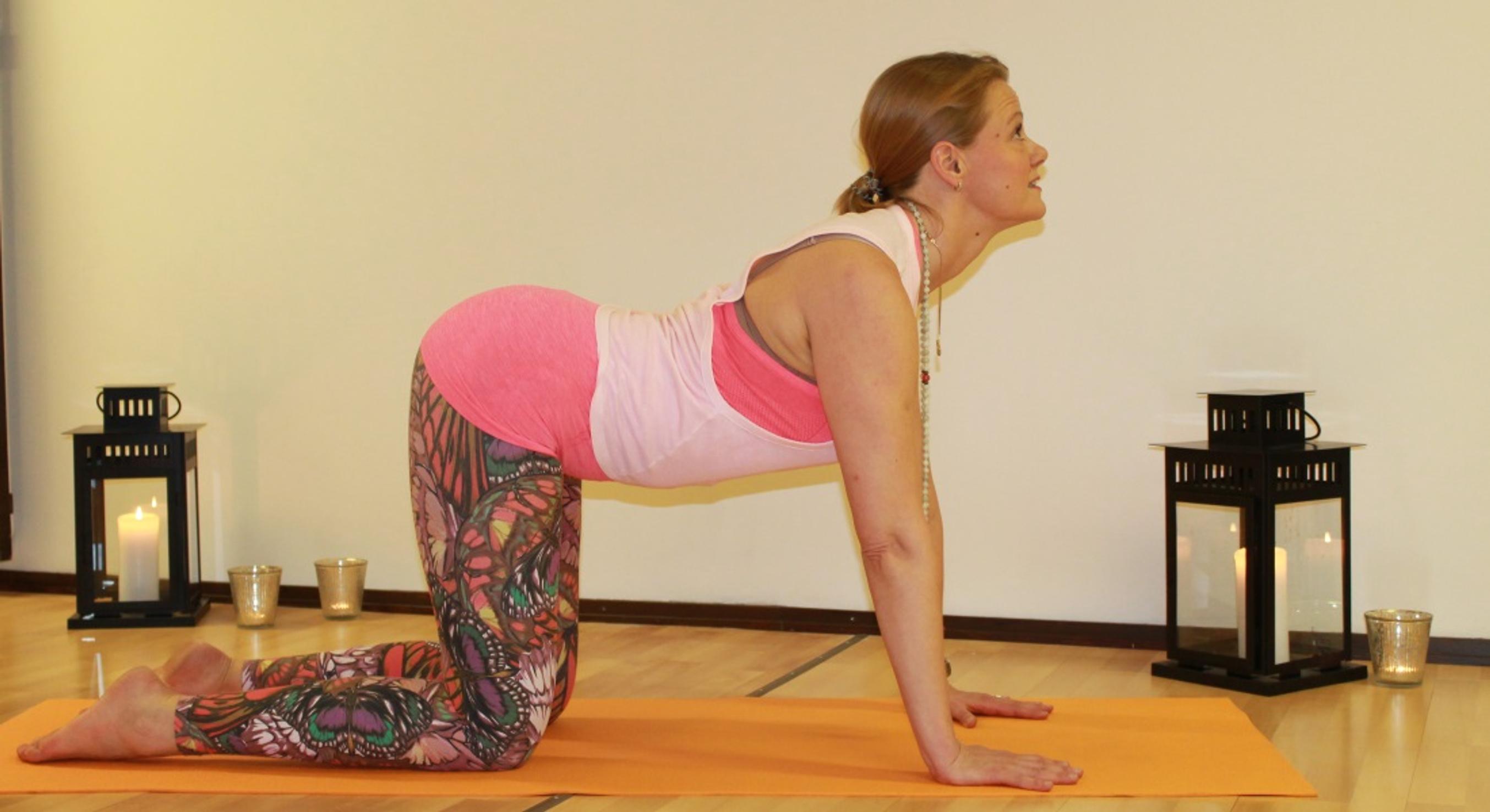 Käy nelinkontin, hengitä sisään ja notkista selkää. Avaa rintakehää ja leukaa ylöspäin siirtäen katse kohti kattoa. Anna hartioiden laskeutua alas ja lapaluiden erkaantua kehon keskilinjasta. Hengitä ulos, vedä vatsaa selkärankaa kohden, pyöristä selkää. Laske leukaa kohti rintaa.