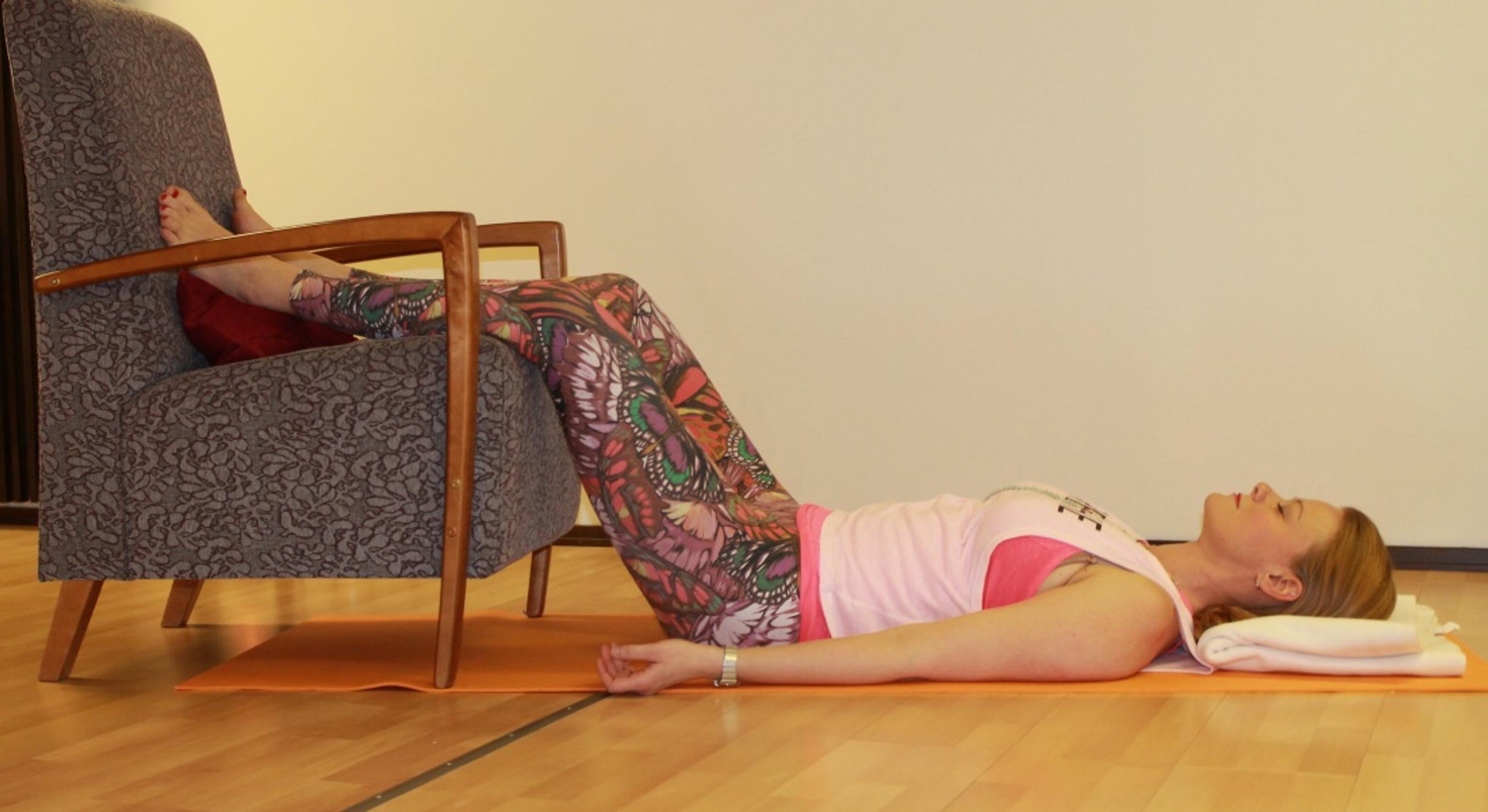 Aseta tarvittaessa pari jämäkkää tyynyä T-asentoon alustallesi, jos jalkasi eivät yletä hyvin tuolille. Käy selinmakuulle tyynyjen päälle ja nosta jalat tuolille. Aseta vielä viltti pään alle. Rentouta kehosi ja sulje silmät. Vie huomio omaan hengitykseesi.