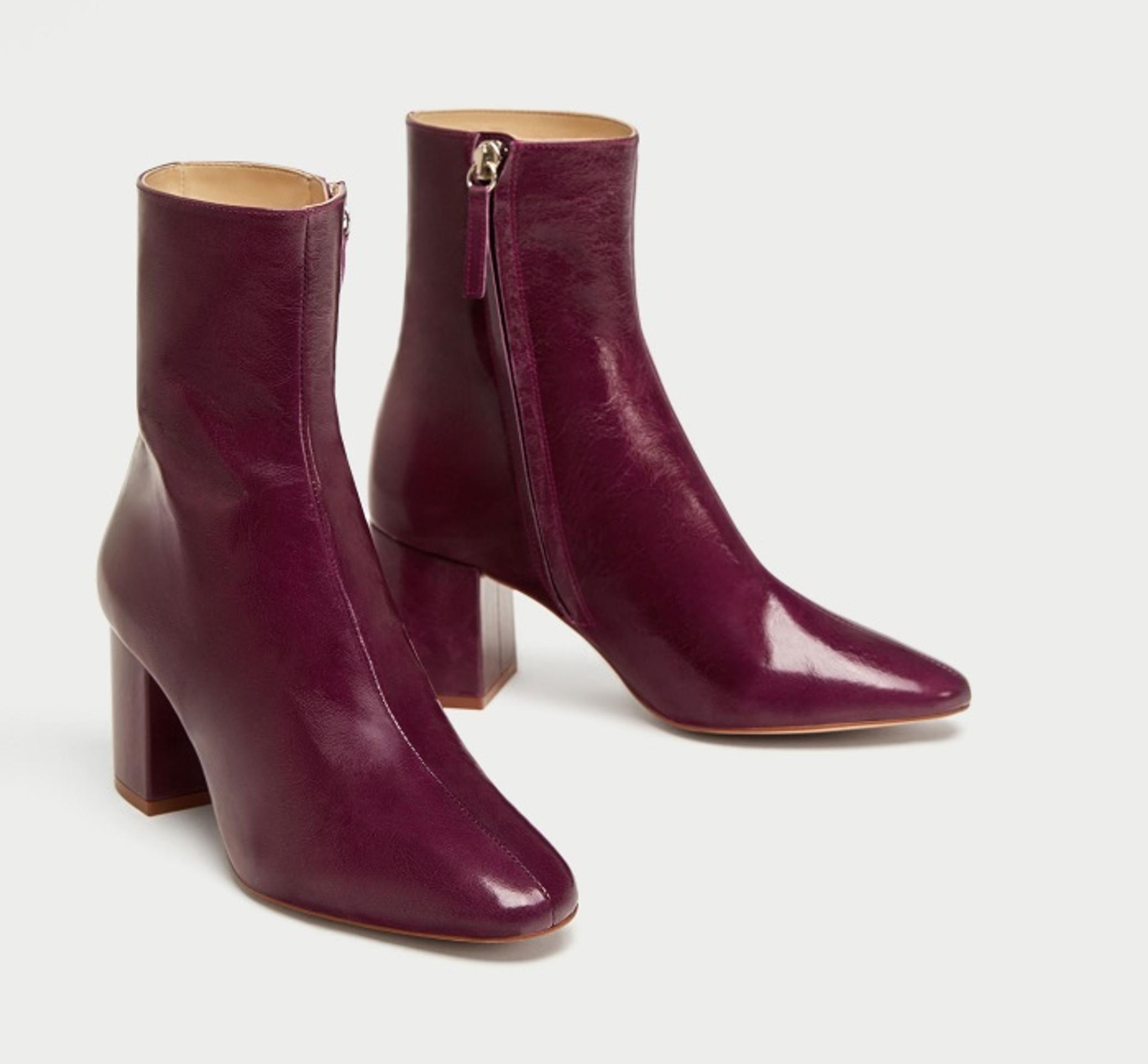 Munakoison väriset nahkanilkkurit tuovat väriä asuun. Suuaukko on kapea, joten malli näyttää hyvältä myös hameiden kanssa. 79,95 e, Zara.