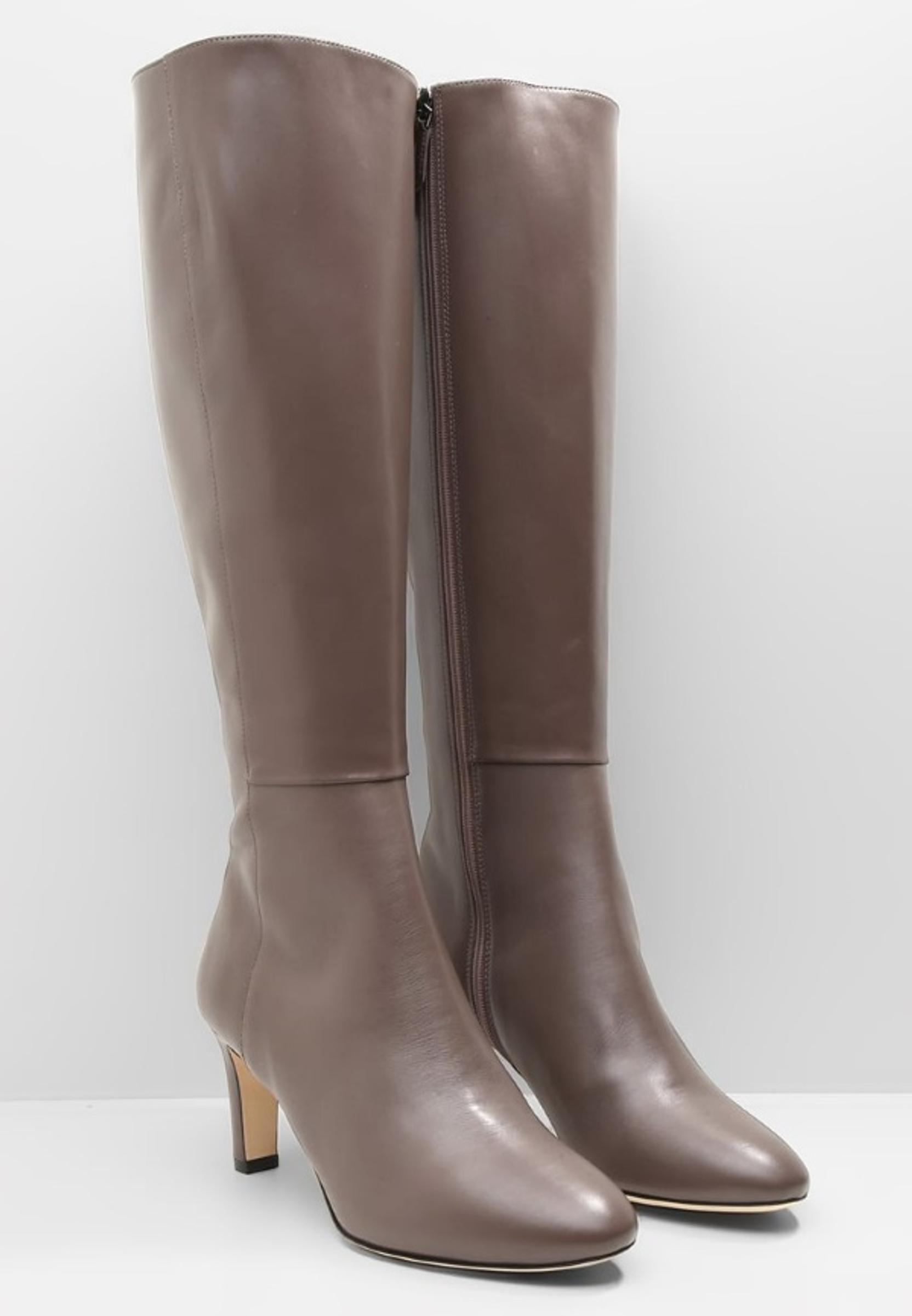 Ruskeanharmaa saapas on helppo yhdistää tyylikkäästi sekä tummaan että vaaleaan asuun. Siro malli on naisellinen ja kestää aikaa. Eloria-nahkasaappaat 494,95 e, LK Bennett.
