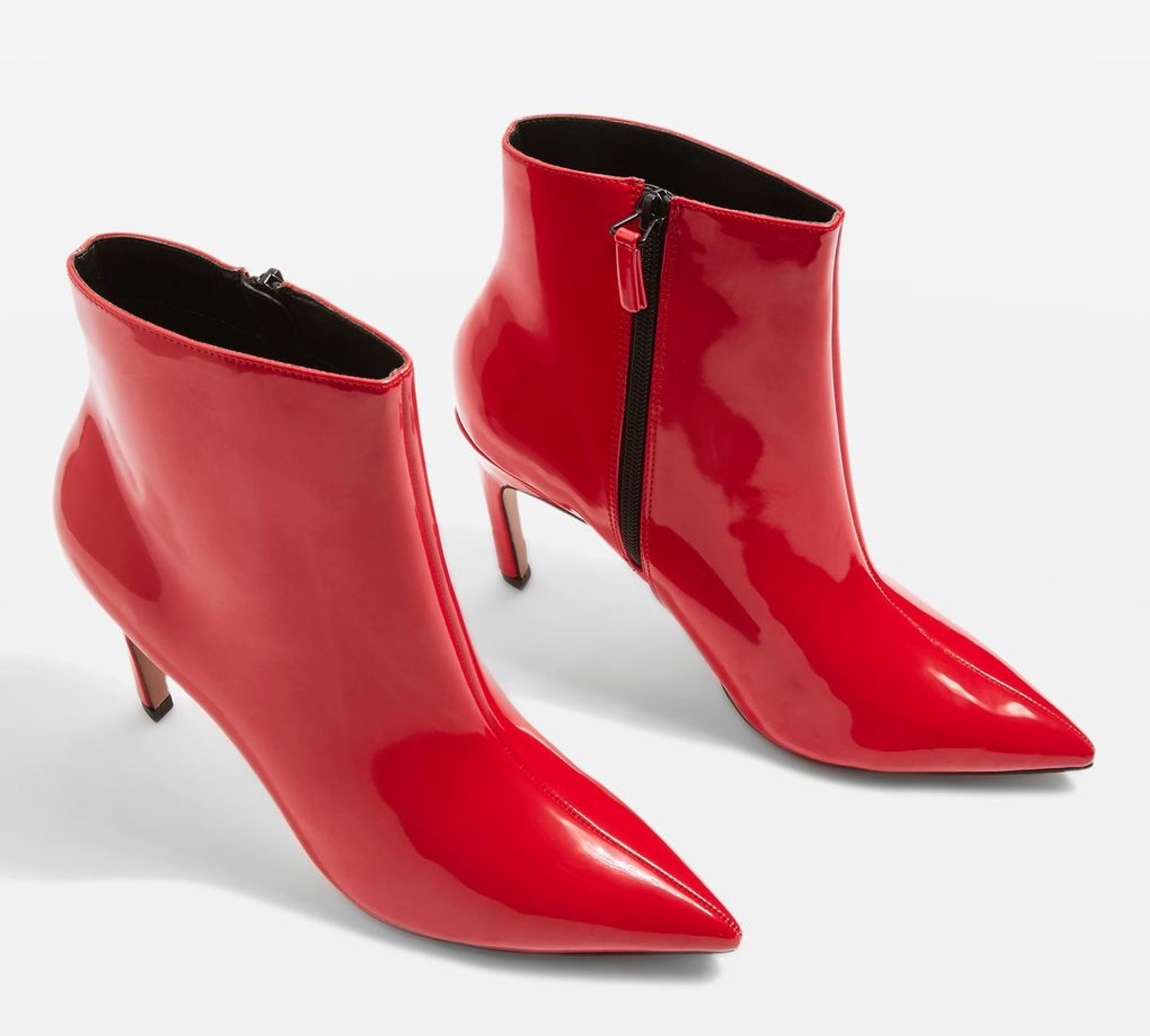 Rohkea, kiiltävä, teräväkärkinen ja punainen – siinä kauden trendikkäimmän nilkkurin tunnusmerkit! Hot Toddy -nilkkurit 67 e, Topshop.