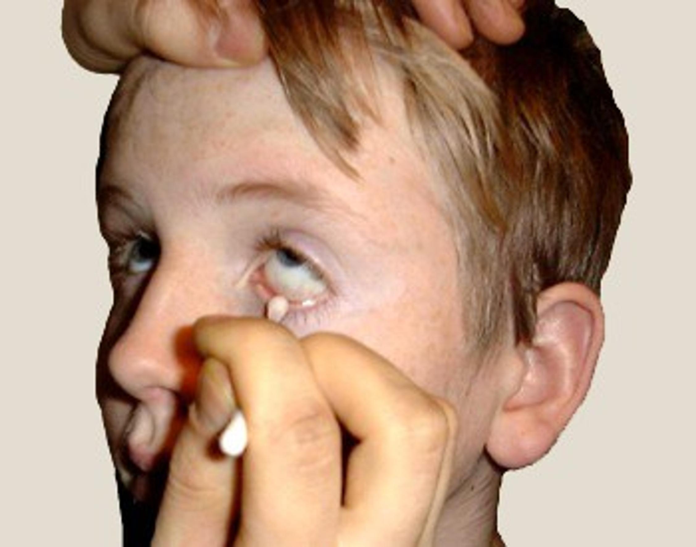 Täytä munakuppi vedellä ja aseta se tiiviisti kipeän silmän ympärille. Olisi hyvä, jos lapsi voi räpytellä useita kertoja samalla, kun vettä kaadetaan silmään. Tämä on vaikeaa pikkulasten ollessa kyseessä, koska he eivät pysty olemaan yhteistyöhaluisia.
