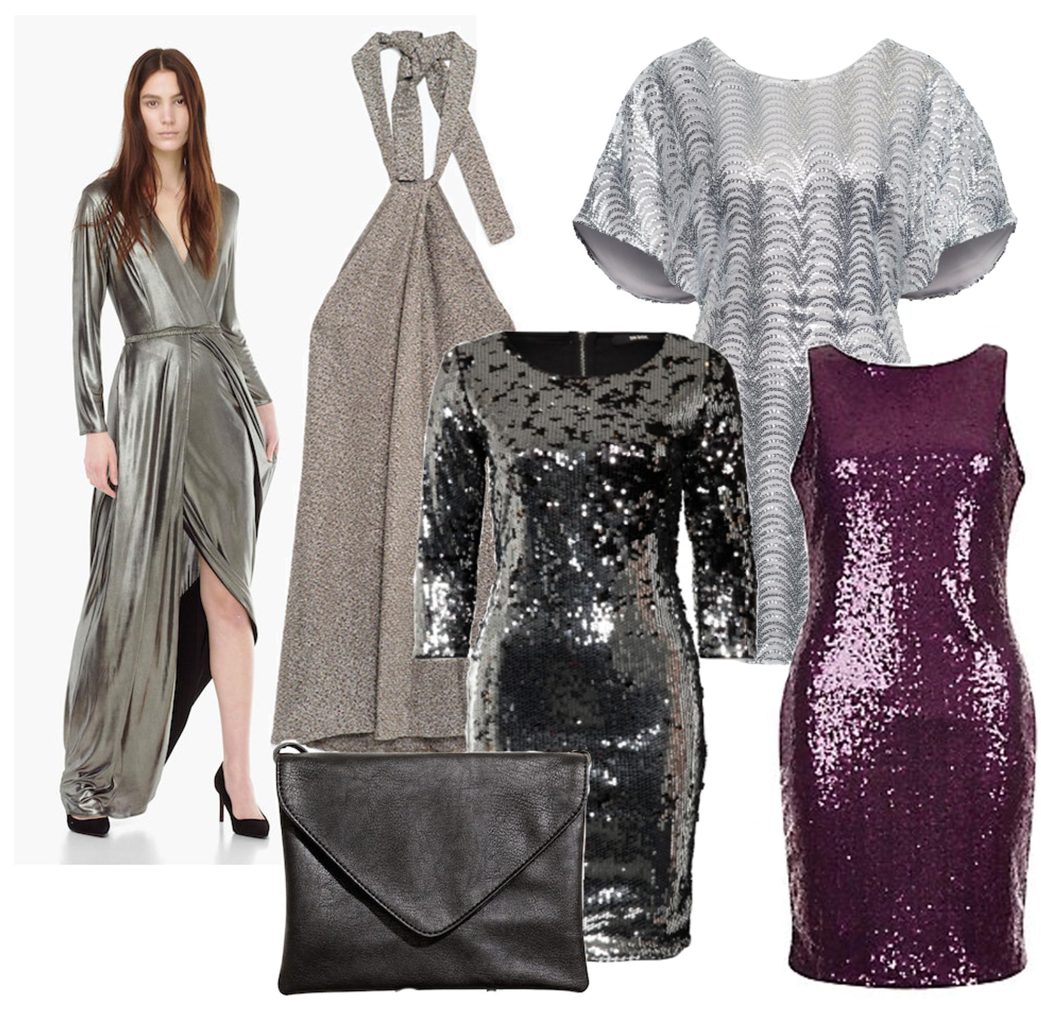 Tunnelmakuvan mekko 69,99 e, Mango. Kultainen mekko 39,95 e, Zara. Keinonahkalaukku 9,99 e, H&M. Pitkähihainen paljettimekko 39,95 e, Bik Bok. Hopeinen, kimonohihainen mekko 99,95 e, Nelly.com. Purppuran sävyinen paljettimekko 44,99 e, Newlook.com.