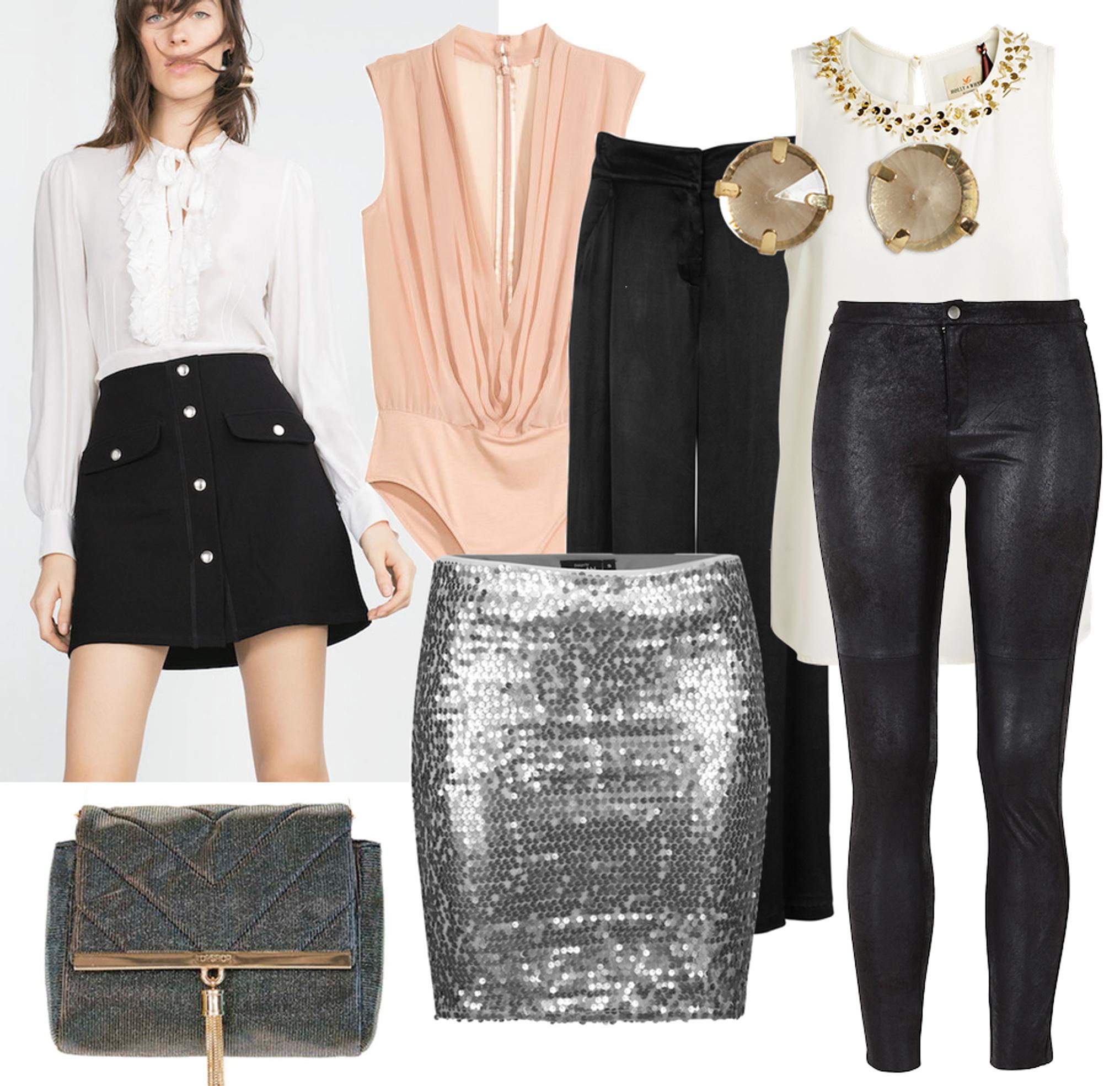 Tunnelmakuvan asukokonaisuus: yläosa 49,95 e ja hame 25,95 e, Zara. Pikkulaukku 34 e, Topshop.com. Body 29,99 e, H&M.com. Leveälahkeiset housut 49,95 e, Gina Tricot. Paljettihame 24,95 e, KappAhl. Valkoinen toppi 24,95 e, Lindex. Korvakorut 4,95 e, Lindex. Legginssit 49,95 e, Gina Tricot.