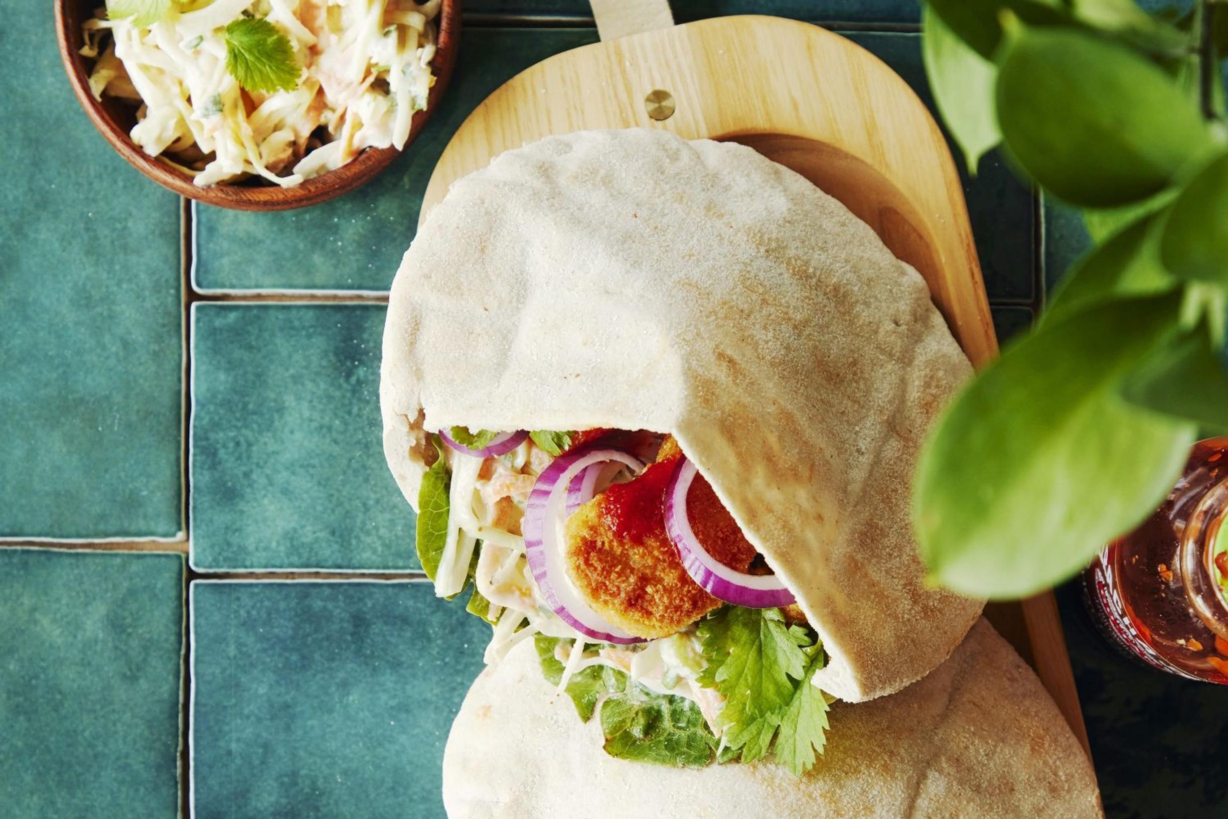 - Lämmitä pitaleivät ja täytä ne kaalisalaatilla ja nugeteilla. Lisää makusi mukaan salaatinlehtiä, punasipuliviipaleita ja chilikastiketta.