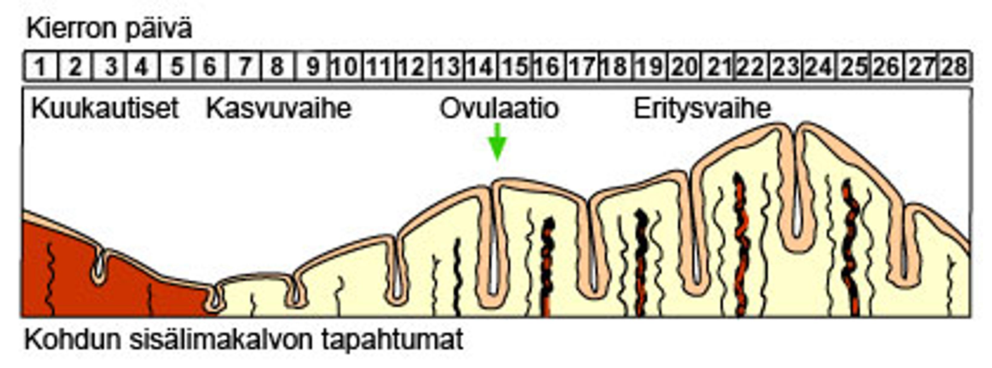 Kuukautiskierron hormonimuutokset kohdistuvat kohdussa sen onteloa verhoavaan limakalvoon eli endometriumiin. Kohdun limakalvolla munasarjojen munarakkulavaihetta vastaa ns. kasvuvaihe ja keltarauhasvaihetta ns. eritysvaihe.