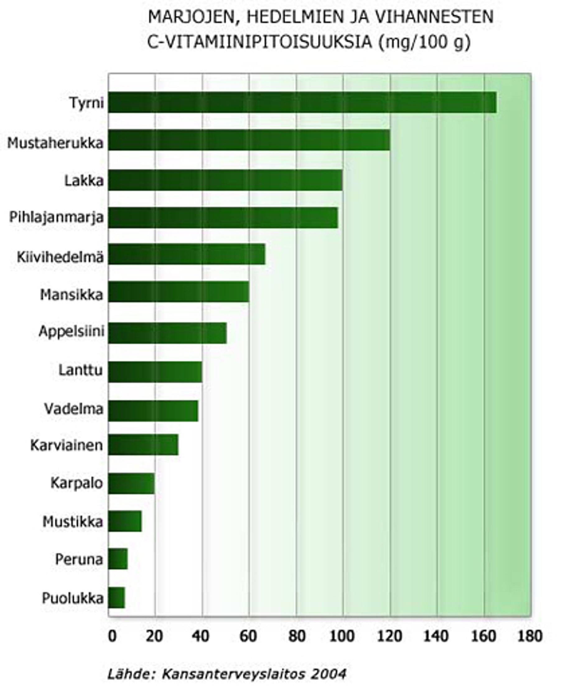 Marjoista tyrni, mustaherukka ja lakka sisältävät eniten C-vitamiinia. Parhaiten vitamiinipitoisuus on tallella tuoreissa marjoissa. C-vitamiini on vesiliukoinen ja hajoaa helposti kun marjoja käsitellään, kuumennetaan, pakastetaan tai säilytetään kauan. Esimerkiksi mehustaminen laskee marjan C-vitamiinipitoisuuden noin puoleen, ja hillossa on tallella noin kaksi kolmasosaa alkuperäisestä vitamiinimäärästä.
