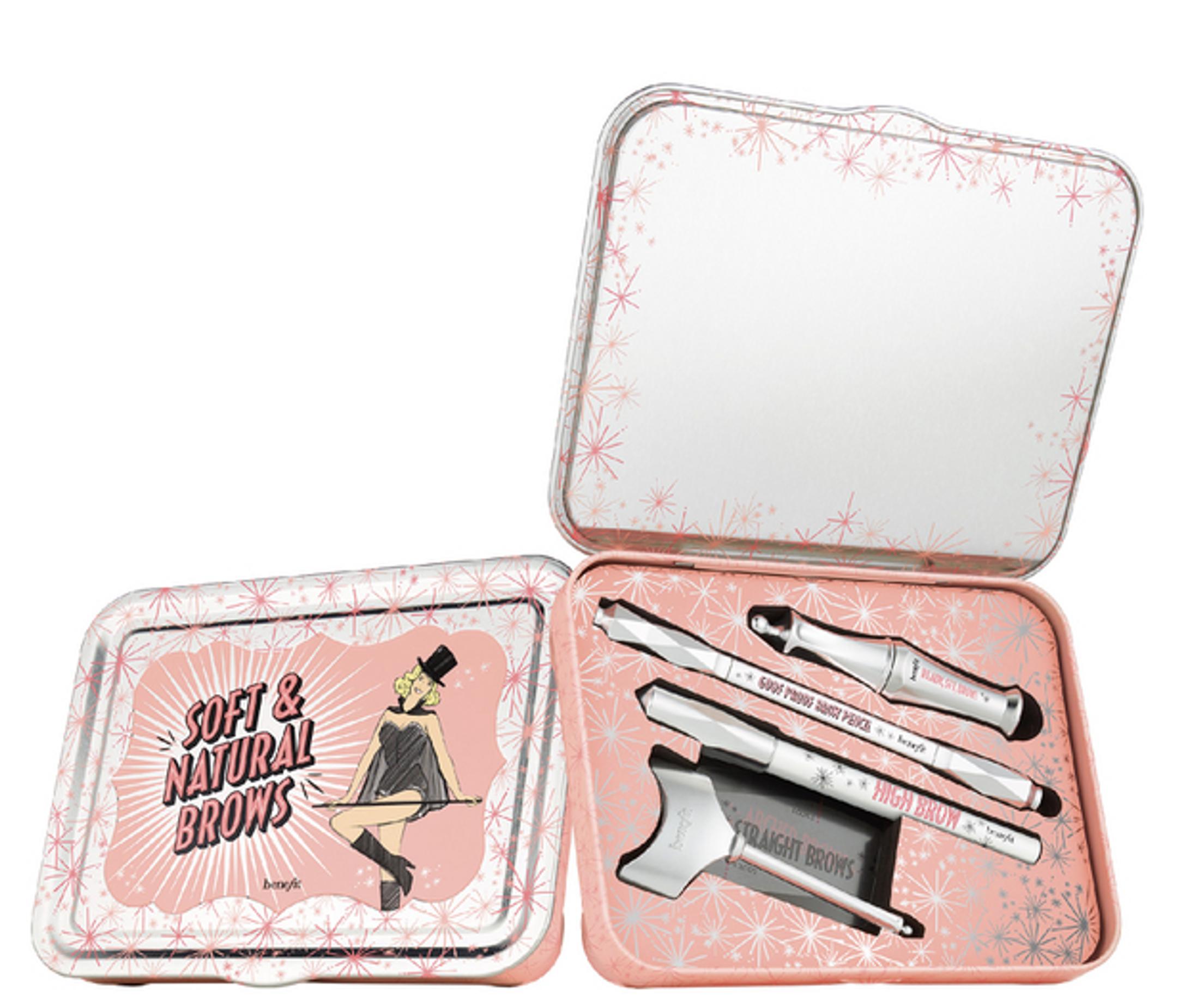 Kaikki tarvittavat välineet kulmien piirtämiseen ja muotoiluun sisältää Benefitin Soft & Natural Brows -peltirasia: kulmakynän, värittömän kulmakarvageelin, korostuskynän kulmaluulle ja muotteja, joiden avulla voi hahmotella kulmien muotoa. 3 sävyvaihtoehtoa. 35 e, lookfantastic.com.