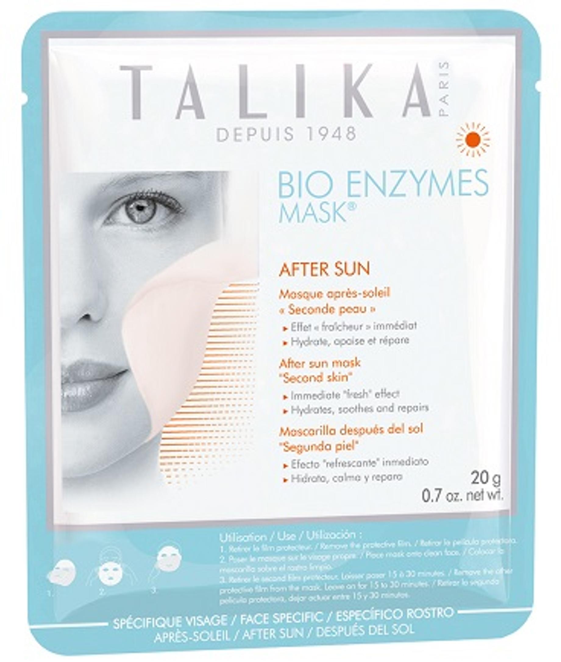 2. Viilentävä, kosteuttava ja rauhoittava Talikan Bio Enzymes Mask After Sun -kertakäyttöinen kasvonaamio virkistää kasvot lentokoneessa tai auringonoton jälkeen. 12 e/1 naamio.