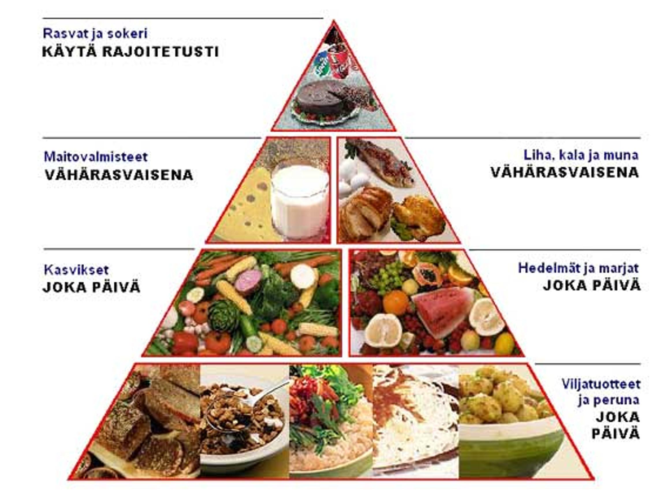 - Toisella tasolla ovat kasvikset, hedelmät ja marjat, jotka sisältävät runsaasti vitamiineja ja kivennäisaineita, mutta vain vähän energiaa. Niitä voi syödä päivittäin runsaasti.