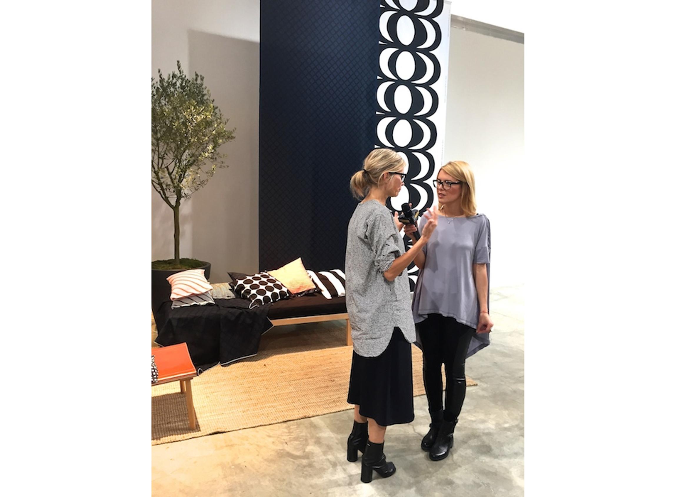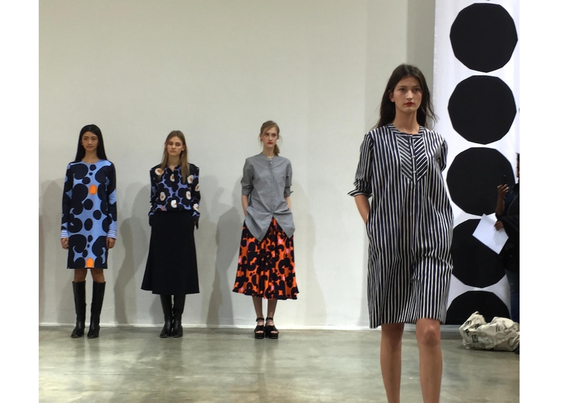 Näytöksen takahuoneessa hyväntuulisella ja sympaattisella Anna Teurnellilla on hetki aikaa kertoa uudesta kokoelmastaan. Teurnell puhuu brändin vaatemallistojen päivittämisestä, ”upliftauksesta”. Käytännössä tämä tarkoittaa materiaalivalintojen ja vaatteiden leikkausten työstämistä entistäkin kiehtovimmiksi. Marimekko-brändin ydin näkyy kuitenkin vahvasti ainutlaatuisissa painokuvioissa ja väriyhdistelmissä.