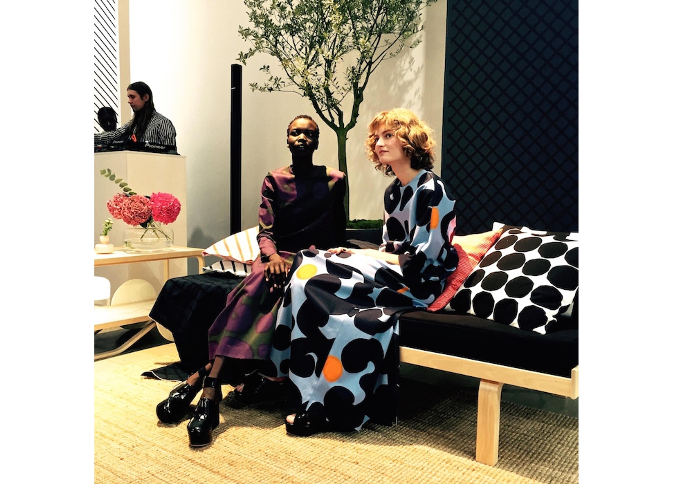 Sunnuntai-iltapäivänä Palais de Tokyon salissa oli tiivis tunnelma, kun muotiväki on kokoontunut katsomaan Marimekon kevät/kesä 2016 -kokoelmaa. Paikalla on muotibloggaajia, kotimaan muotivaikuttajia sekä kansainvälistä lehdistöä, kuten Kiinan Voguen edustajat. Näkyypä yleisön seassa yksi tunnetuimmista muotibloggaajista, Style Bubble -blogia pitävä Susanna Lau. Näytöstila on somistettu kotoisasti Marimekko-nurkkauksineen ja seinällä roikkuu designtalon klassikkoverhokankaita. Tarjoilijat kantavat kuohuvaa muotiväelle Sukat makkaralla -sarjan laseista.